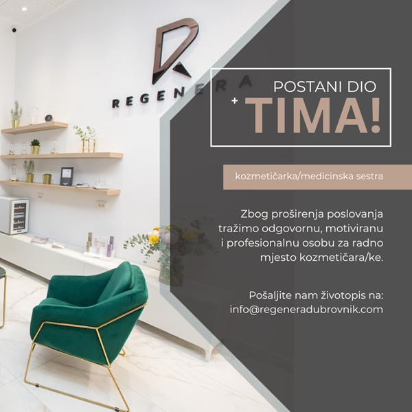14 travnja, 2026 Beauty, Skin Postani dio tima Zbog proširenja poslovanja tražimo odgovornu, motiviranu i profesionalnu osobu za radno mjesto kozmetičara/ke. Pošaljite nam životopis na: info@regeneradubrovnik.com